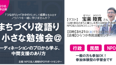 中間支援者の今、ご存知ですか? 宝楽さんをお招きし、勉強会を開きます。 まちづくり夜語り 小さな勉強会@ コーディネーションのプロから学ぶ、中間支援のあり方 「連携」「協働」「共創…」、多様な主体がさまざまな関わりをつくり、まちや地域の課題解決や、新しい価値を生みだす動きが活発化してい...